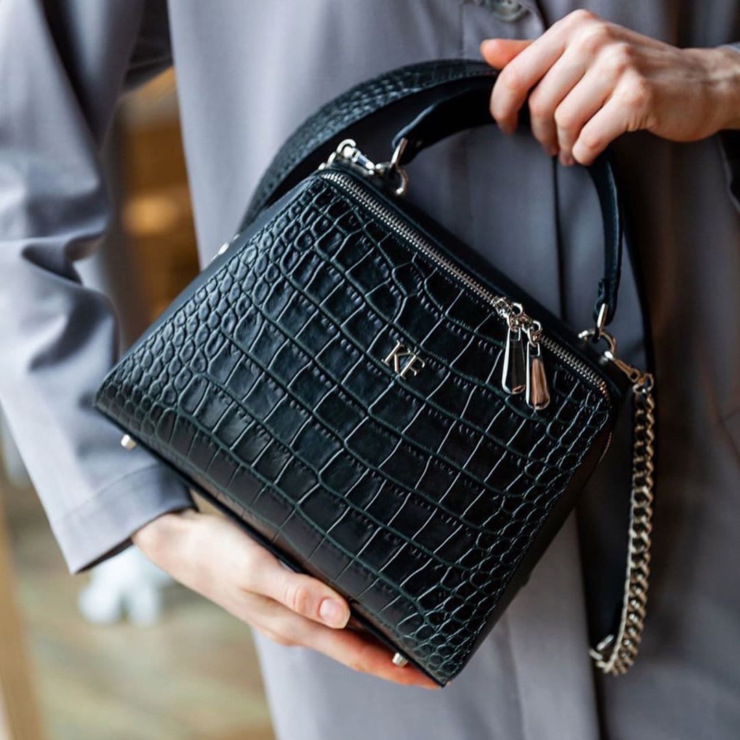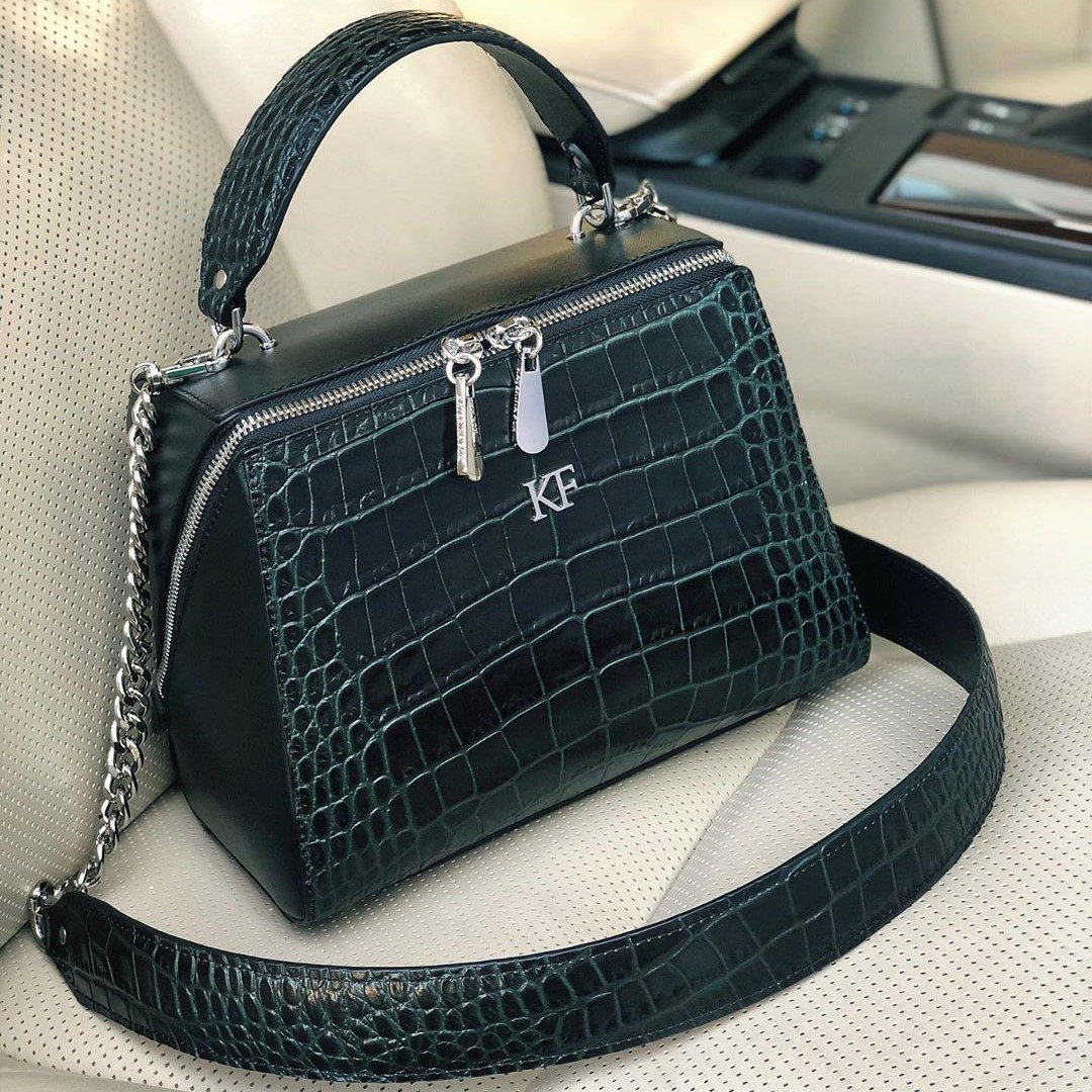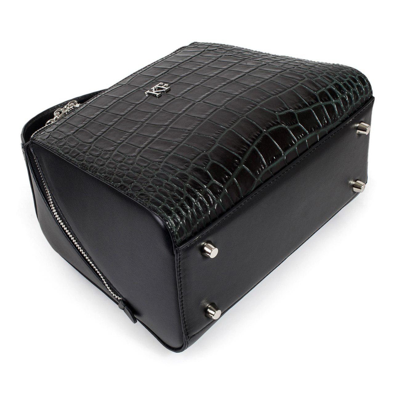 Black/Green genuine leather handbag from ukrainian designer Katerina Fox. This model is designed for women who appreciate the sleek design combined with functionality and comfort. High-quality and reliable hardware ensure long service bags. The internal space of a bag is equipped with one spacious compartment and two patch-pockets and one zipper pocket. The bag is closed with a zipper. The bottom of the bag is protected with metal legs. There is a long handle that allows you to wear the bag on the shoulder. The kit also includes a storage bag.