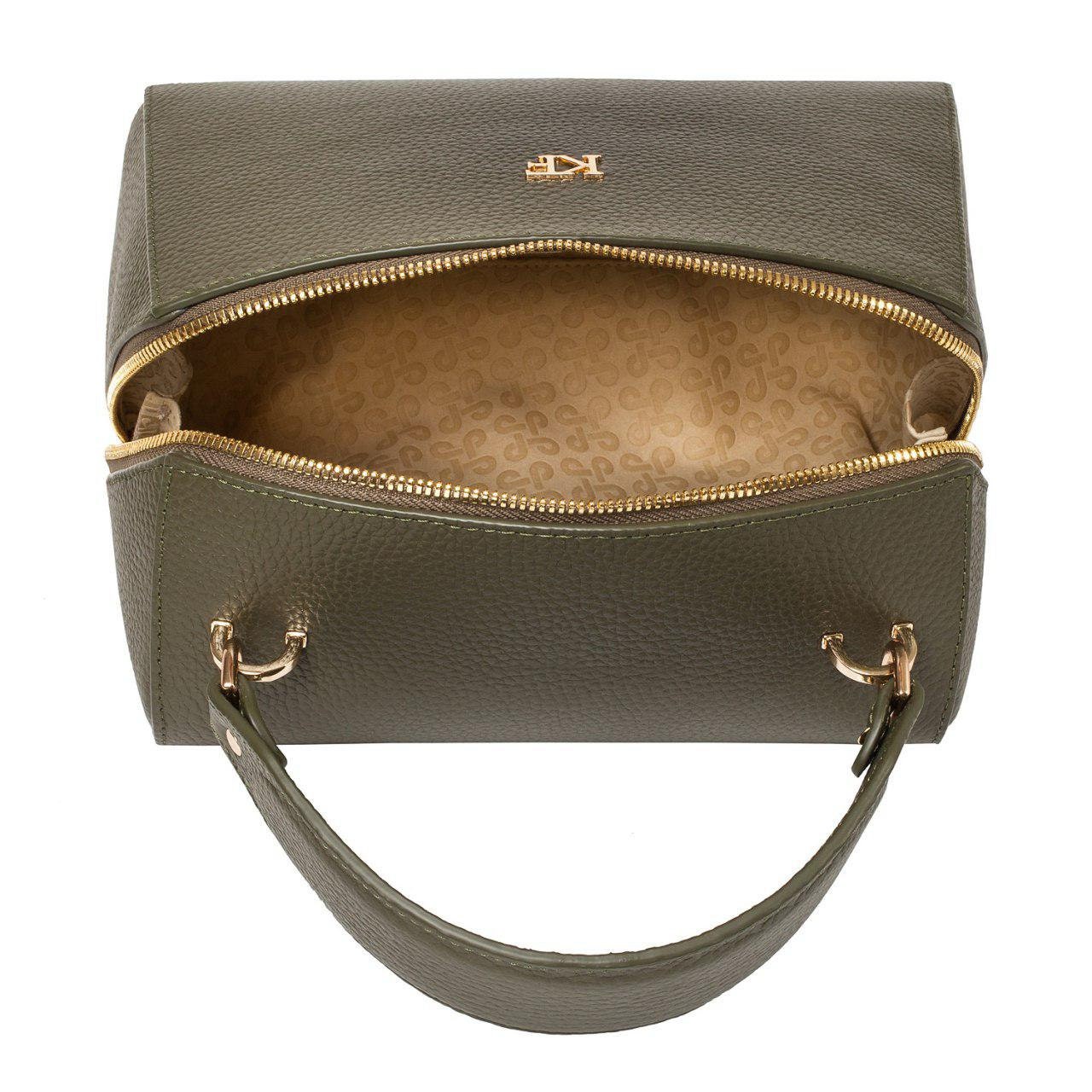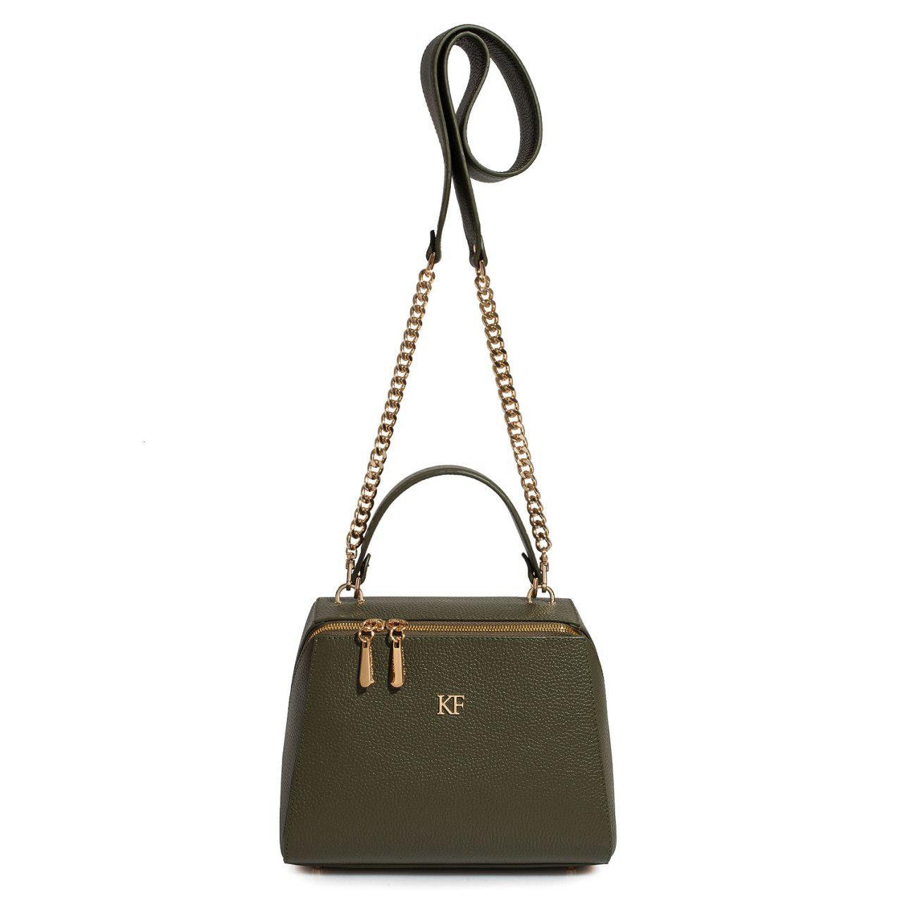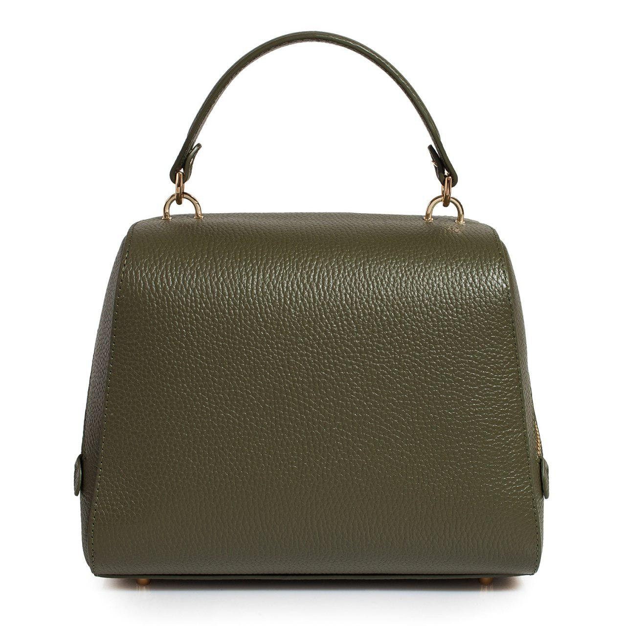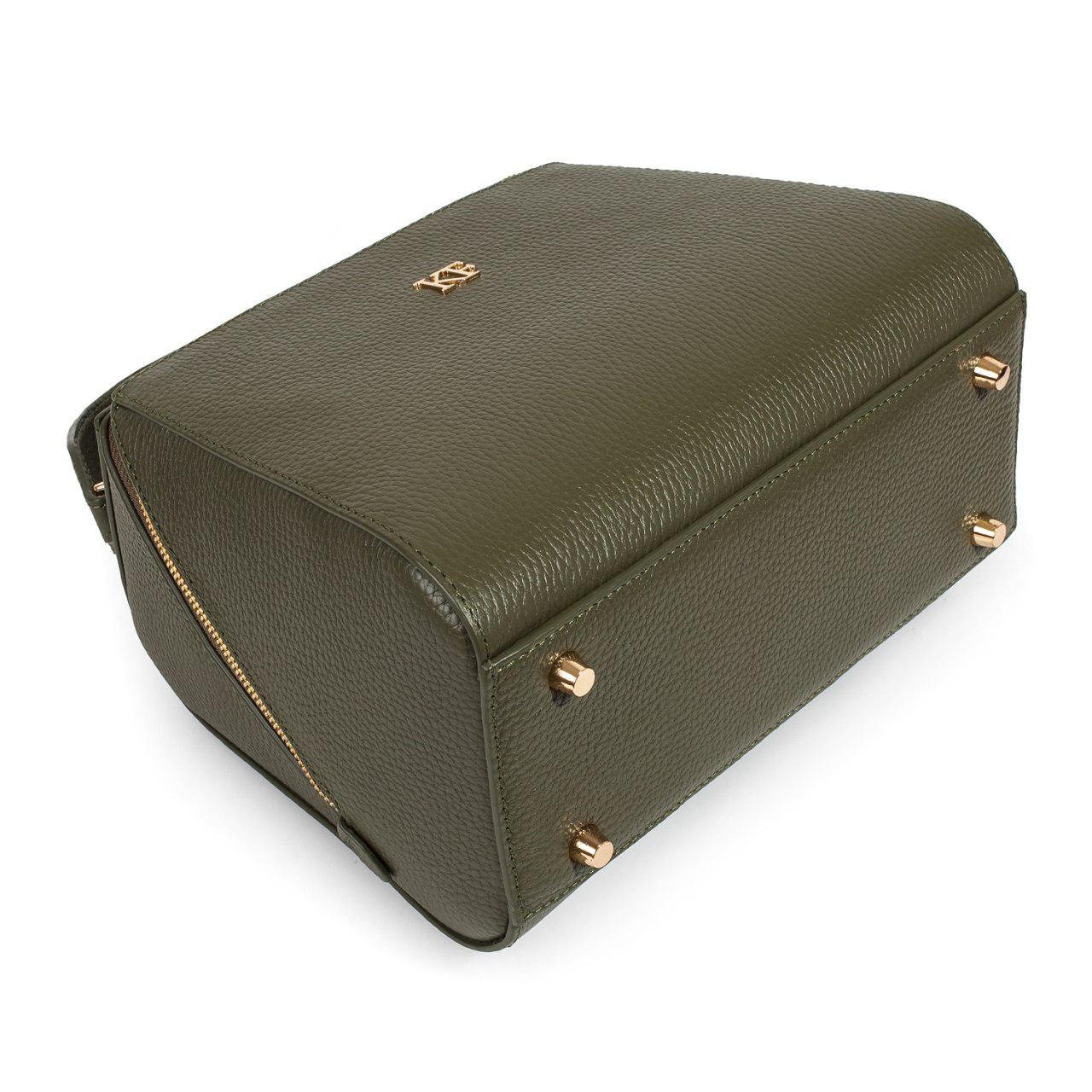 Olive genuine leather handbag from ukrainian designer Katerina Fox. This model is designed for women who appreciate the sleek design combined with functionality and comfort. High-quality and reliable hardware ensure long service bags. The internal space of a bag is equipped with one spacious compartment and two patch-pockets and one zipper pocket. The bag is closed with a zipper. The bottom of the bag is protected with metal legs. There is a long handle that allows you to wear the bag on the shoulder. The kit also includes a storage bag.