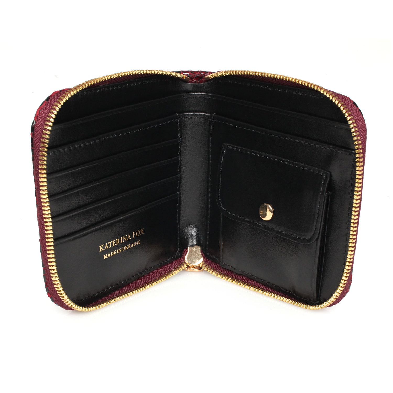 Red genuine leather snake print woman wallet from ukrainian designer Katerina Fox. A stylish accessory – a necessary purchase for many women. Wallet KF like women who value practicality and beauty. The internal space of a wallet is equipped with two large compartments for banknotes, a pocket for coins and four business card compartments and two auxiliary compartments. The wallet is closed with a zipper. The kit also includes a storage bag.